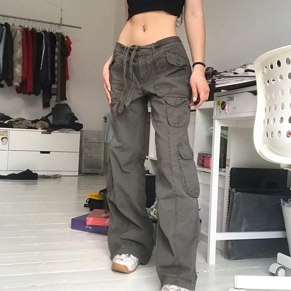 男性と女性のためのヴィンテージマルチポケットディストレストカーゴパンツ、ルーズフィットスリミングストレートレッグカジュアルパンツ、アメリカスタイル y2k ボトムス T240901102957_01